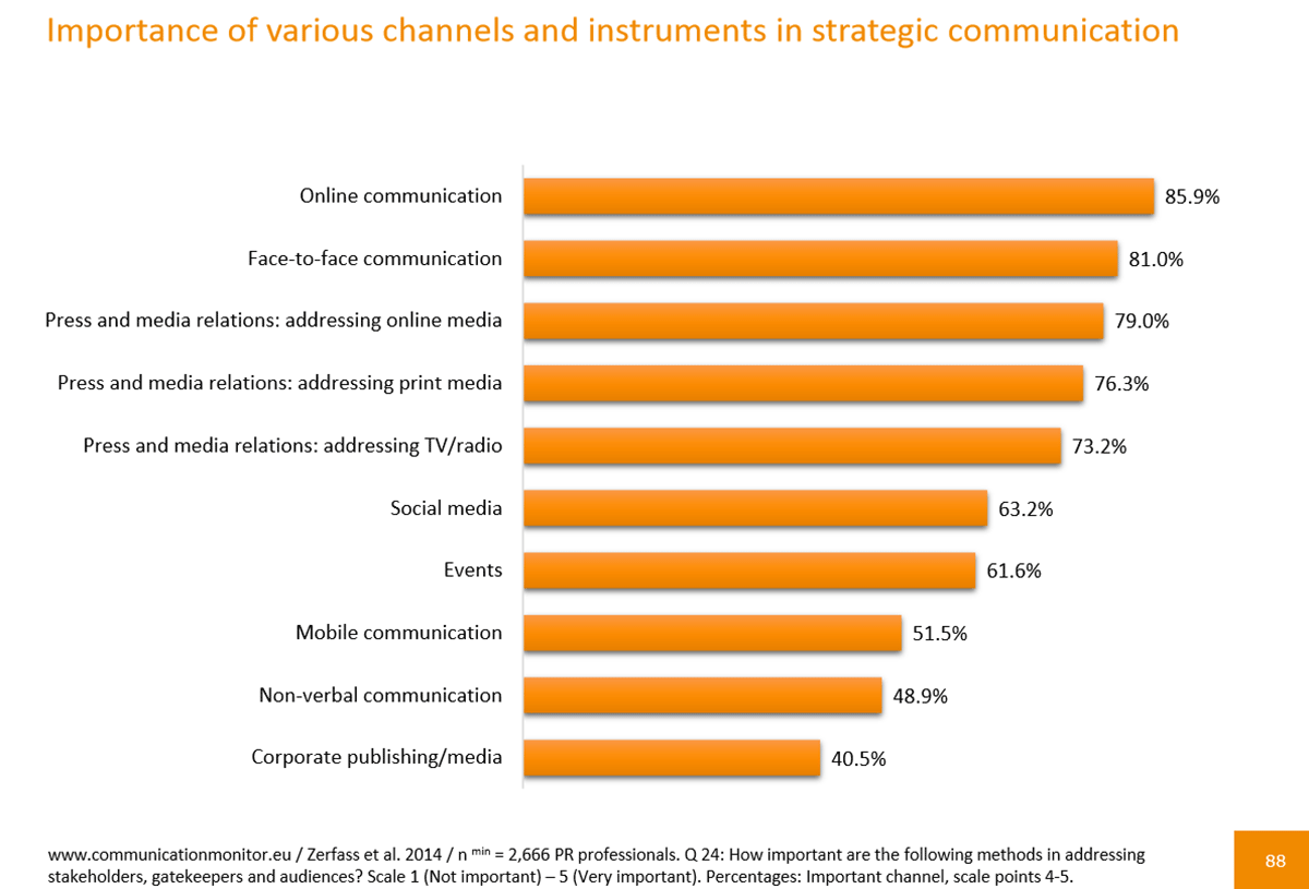 Es ist kaum verwunderlich, dass Online-Kommunikation bereits heute schon die strategische Kommunikation dominiert und auch zukünfitig an Bedeutung zunehmen wird. Auch überrascht es wenig, dass Mobile und Social-Media-Kommunikation rasch an Relevanz gewinnen. Aber die klassische Presse- und Medienarbeit verlieren stark an Boden; ebenso wie der Bereich Corporate Publishing.